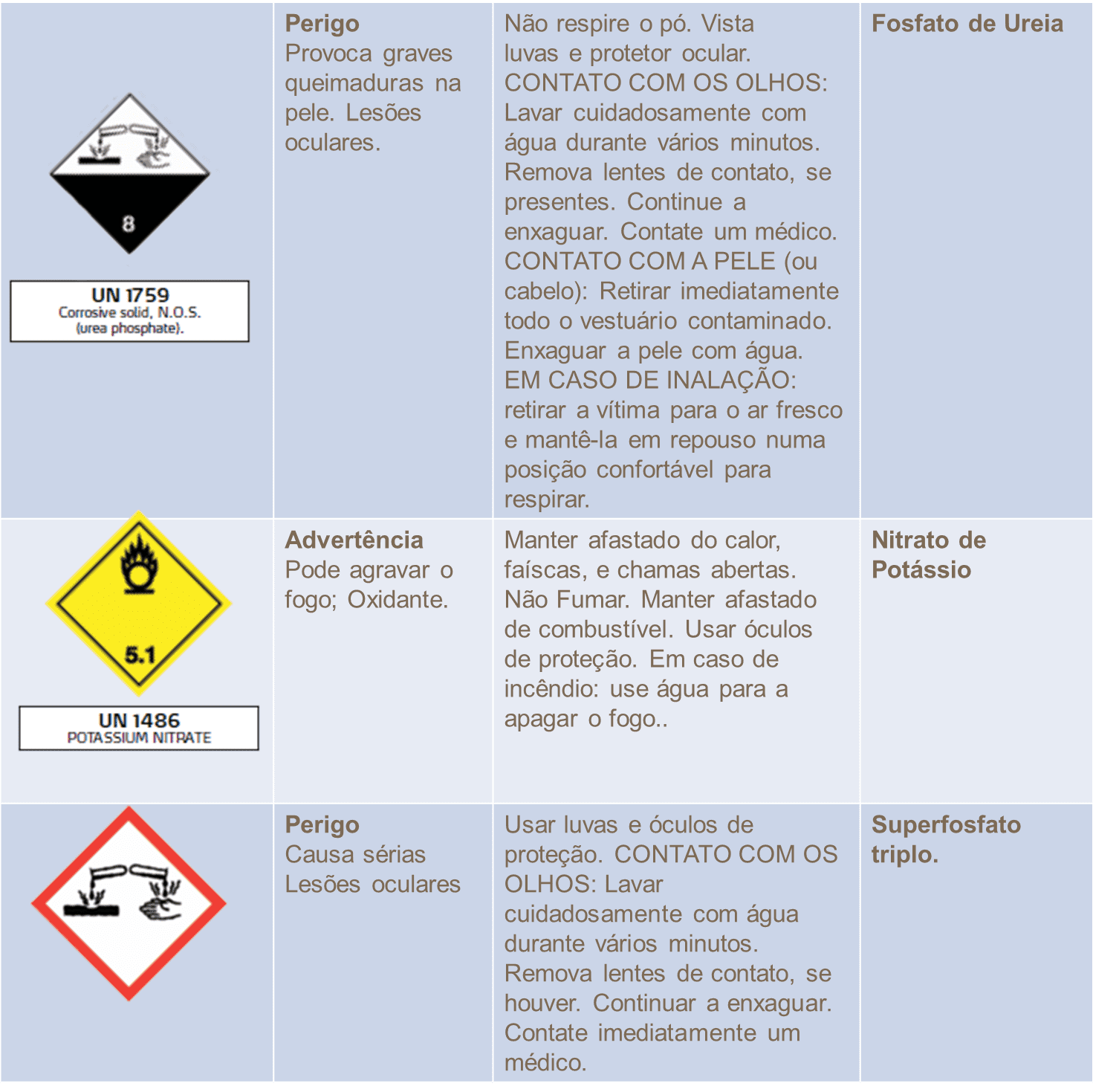 Você encontrará informações importantes para o transporte, o armazenamento e o manuseio impressas no rótulo do saco do fertilizante. A classificação do produto e a rotulagem está em conformidade com as legislações nacionais e o regulamento da UE, e a classificação do transporte está de acordo com os Regulamentos-Padrão para o Transporte de Produtos Perigosos (TDG) da ONU. A composição química do produto está especificada no saco e está de acordo com o regulamento nacional de cada país. Os escritórios locais de vendas podem fornecer mais informações e assistência.